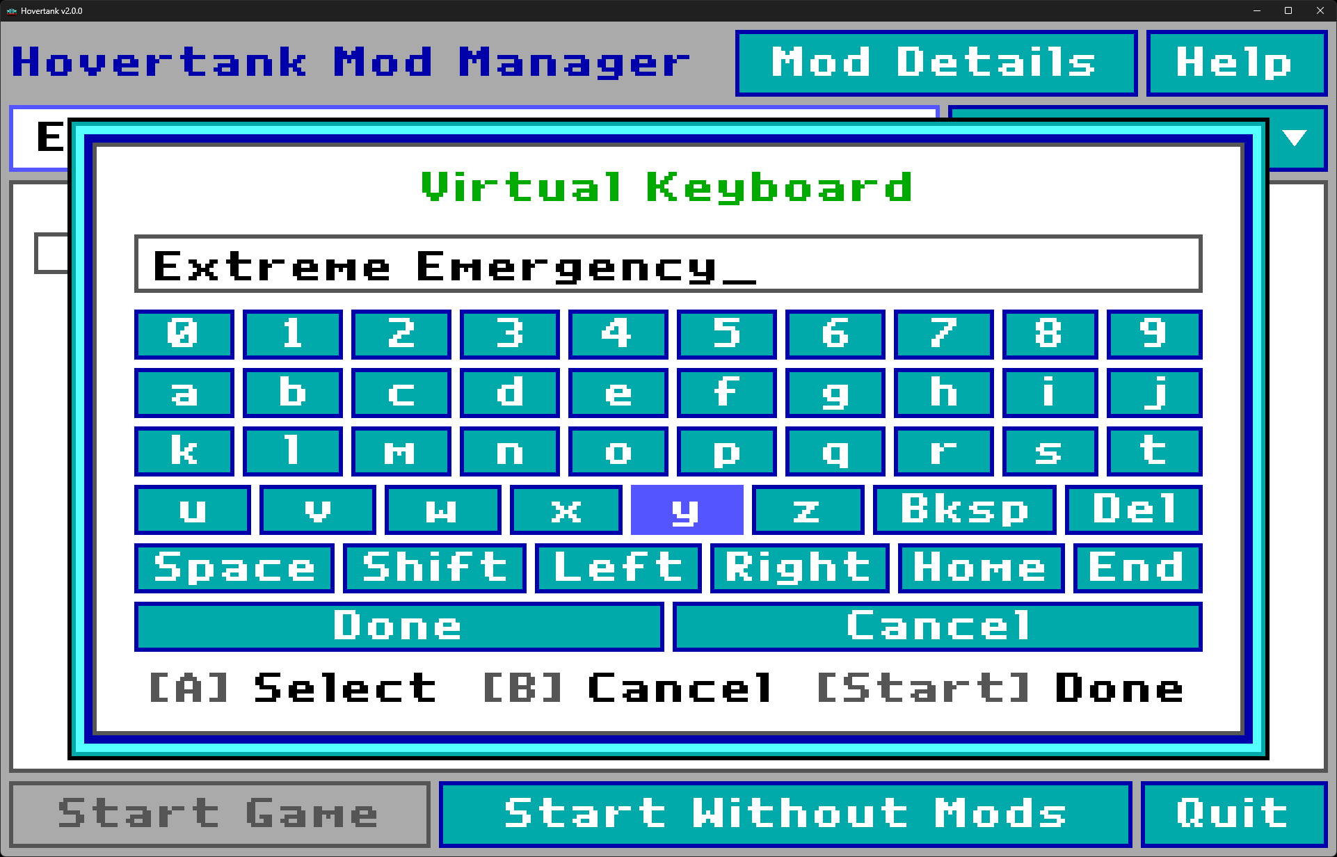 Below are screenshots showcasing the virtual keyboard in the Mod Manager search when using a controller, as well as in Hovertank's in-game dialogs.